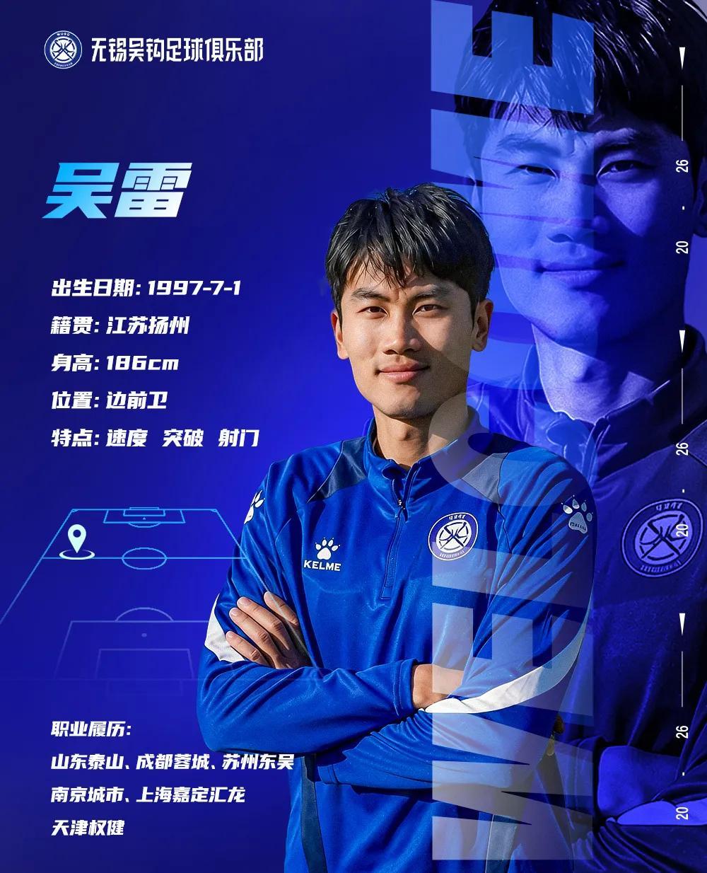 球员心声: “非常开心能回到江苏,加入无锡吴钩这个充满朝气的集体。我会用我的经验和速度,为球队的边路进攻带来帮助。新的挑战,我已经准备好,为无锡而战!”